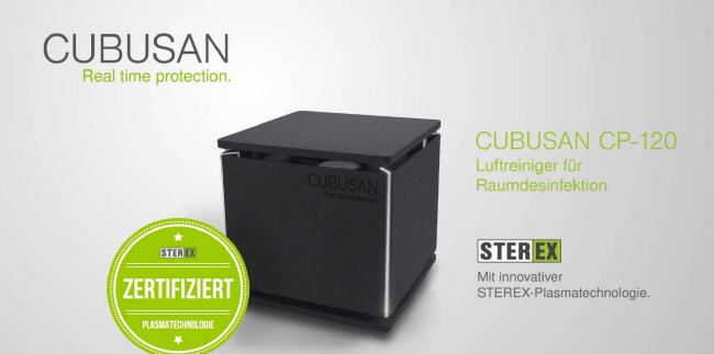 Mit kaltem, atmosphärischem Plasma beseitigt STEREX bis zu 99,99% aller behüllten Viren, Bakterien und Pilzsporen in der Raumluft und auf Oberflächen – einschließlich SARS-CoV-2 Viren und deren Mutationen. Durch den Einsatz der STEREX-Plasmatechnologie im neu entwickelten Luftreinigungswürfel „CUBUSAN“ wird die Keimbelastung in Räumen auf ein Minimum reduziert. Der Aufenthalt von Personen in Büros, Geschäftsräumen, Hotels, Schulen, Gastronomie, Altenheimen und anderen geschlossenen Räumen wird durch die stark reduzierte Infektionsgefahr deutlich sicherer.