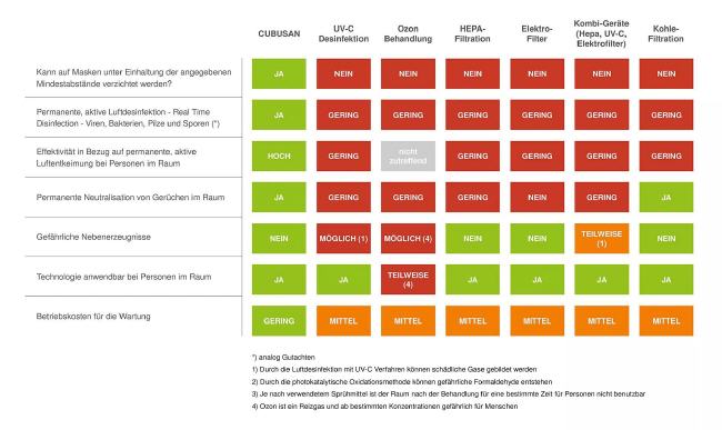 Der Wirkungsgrad von bis zu 99,99% kann nur bei einer Raumtemperatur von 18-24°C und einer relativen Luftfeuchte von 30-60% erreicht werden. Es wird eine Mindestluftfeuchtigkeit (rel.) von 10% vorausgesetzt, damit Hydroxyl-Radikale in ausreichender Anzahl gebildet werden können. Das Raumvolumen von 120m³ / CUBUSAN darf nicht überschritten werden.