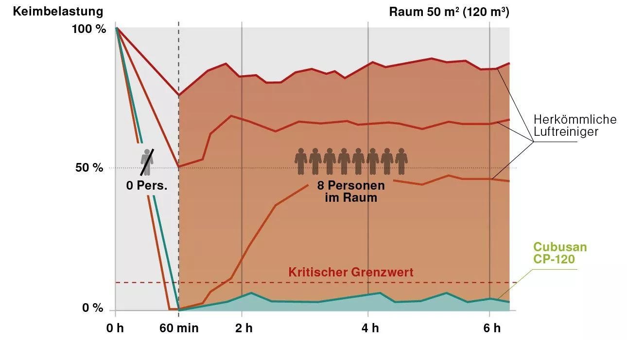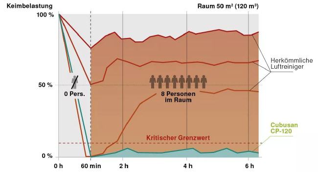Das Diagramm zeigt die Keimbelastung in einem 120m⊃3; Raum unter Einsatz des CUBUSAN CP-120 im Vergleich zu herkömmlichen Luftreinigungsgeräten. Während der CUBUSAN CP-120 nach nur einer Stunde die Luft in einem leeren, jedoch keimbelasteten, Raum bis zu 99,99% desinfiziert, benötigen manche Geräte dazu lt. Herstellerangaben mehrere Stunden. Ab dem Zeitpunkt, zudem sich wieder Personen im Raum befinden, steigt die Keimbelastung bei herkömmlichen Luftreinigungsgeräten wieder an. Die Raumluft müsste für eine wirksame Reduktion der Keimbelastung permanent mindesten 6-8 mal/Stunde vollständig umgewälzt werden (was zu starkem Luftzug und einer Geräuschbelästigung führen kann), da die ausgeatmeten Aerosole erst über die Luftumwälzung wieder eingesogen und herausgefiltert werden müssen. Beim CUBUSAN CP-120 hingegen, werden die Aerosole unmittelbar nach dem Ausatmen durch die Hydroxyl-Radikale in der Luft neutralisiert und das Risiko einer Übertragung der Keime an andere Personen ist unter Einhaltung eines Mindestabstands von 1 Meter (bzw. 3,5m⊃2;/Person) PERMANENT auf sehr niedrigem Niveau.