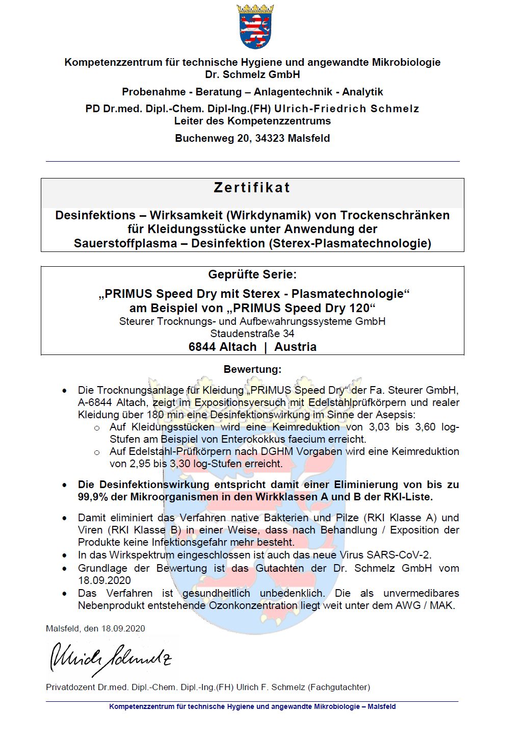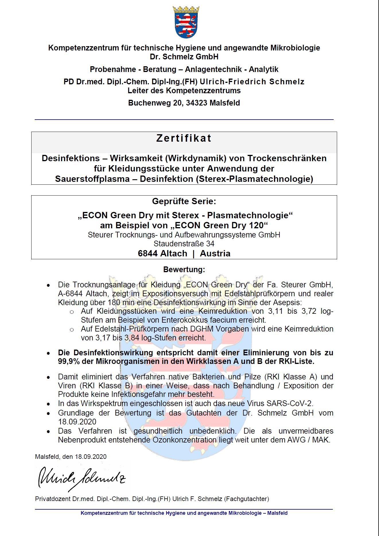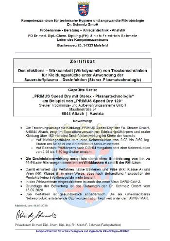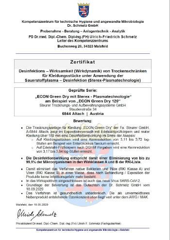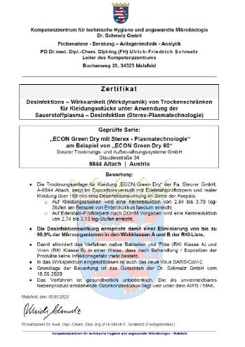 Die desinfizierende Wirksamkeit der STEREX-Technologie wurde vom anerkannten Kompetenzzentrum fur technische Hygiene und angewandte Mikrobiologie Dr. Schmelz GmbH in D-Malsfeld durch Hr. PD Dr.med. Dipl.-Chem. Dipl-Ing. (FH) Ulrich-Friedrich Schmelz bestätigt.